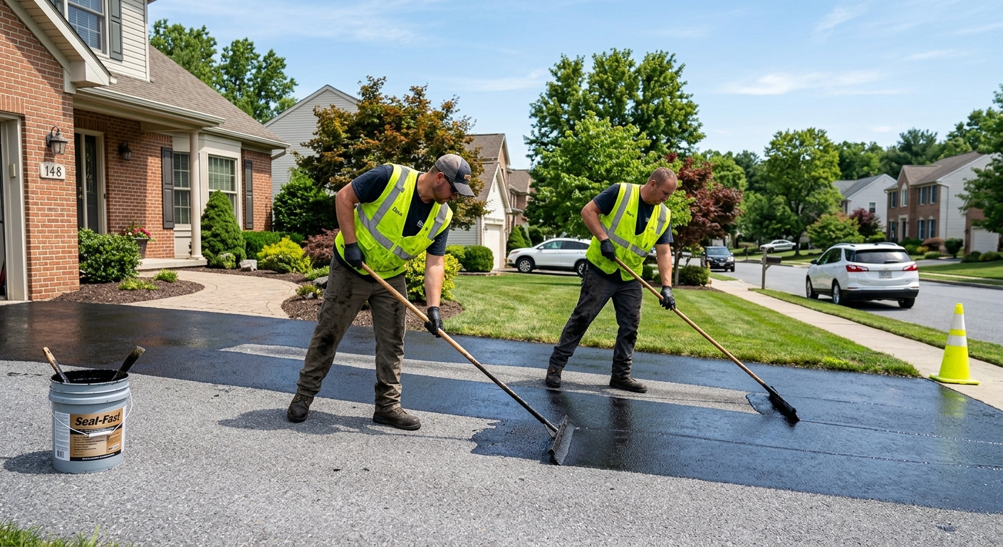 Hot-pour rubber crack filler and sealcoating prevent water infiltration and freeze-thaw damage in Fairview's climate. Extends driveway life and prevents costly repairs.